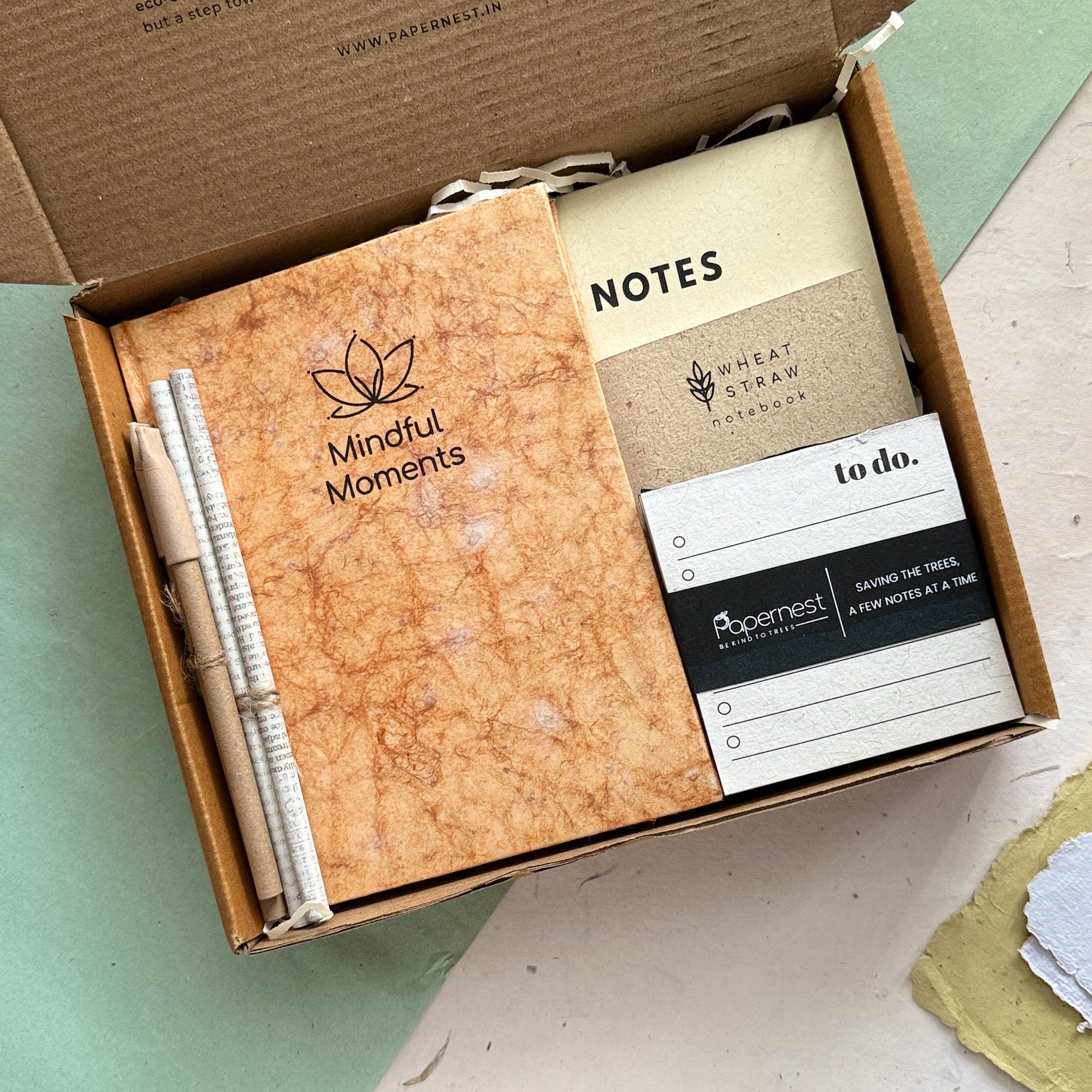 Treeless Treasure Box - our stationery box is meticulously curated to include a variety of stationery essentials like notebooks, notepads, pens, pencils, letter envelops and other desk accessories. Our commitment to sustainability starts with the materials we use. The minimalist design makes it perfect for personal or corporate gifting.