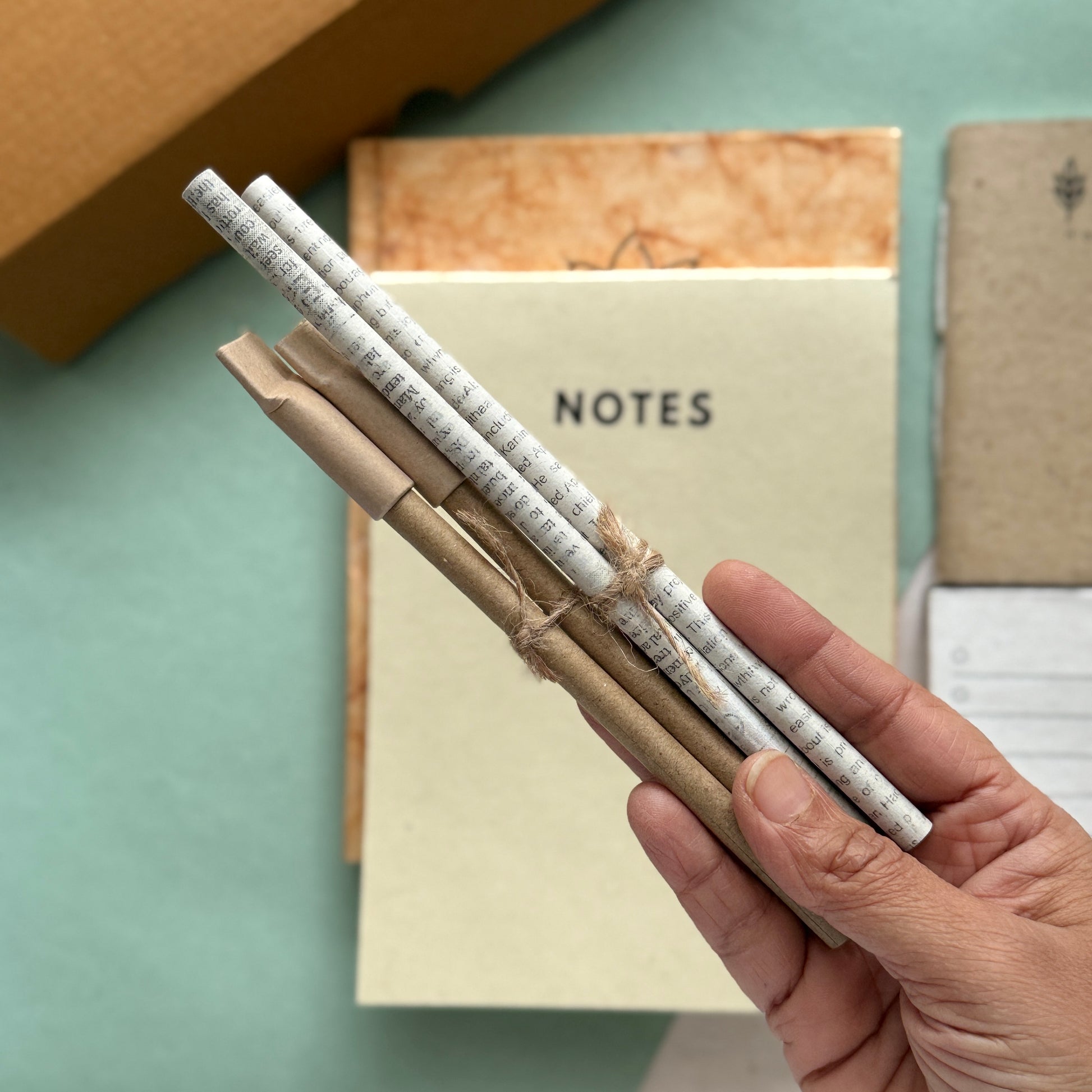 Sustainable Product: our entire stationery line is made using handmade paper upcycled from cotton rag waste generated in garment units, making sure that we don’t have to cut down our super important trees. Our pens and pencils are made from sustainable materials such as waste newspapers & recycled paper.